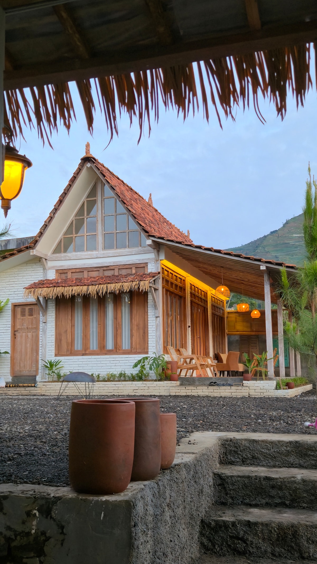 vila estetik bernama Oleilu di Dieng, Wonosobo, dengan desain unik perpaduan gaya A-frame dan rustik Jawa. Vila ini menawarkan pemandangan pegunungan dan perkebunan sayur yang indah.