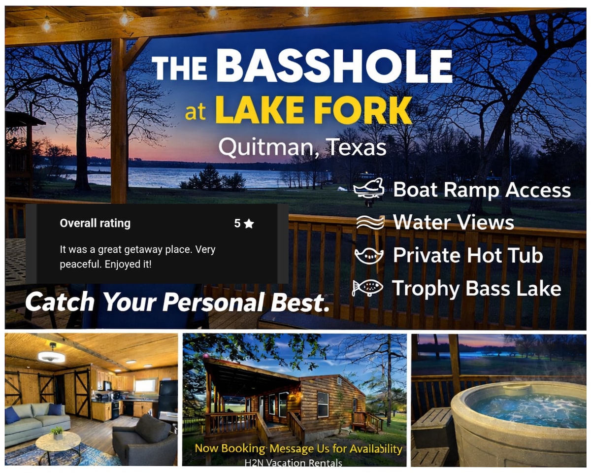 Waterfront on Lake Fork near 154 bridge and Bird Island Whether from a boat, kayak, dock or bank experience the top rated Lake Fork at this property. Cabin is a 2 bedroom (queens) with a sleeper sofa and 2 bathrooms and kitchen and at the end of the day you won't be disappointed with the beautiful cove sunsets. plenty of outlets for boat charging