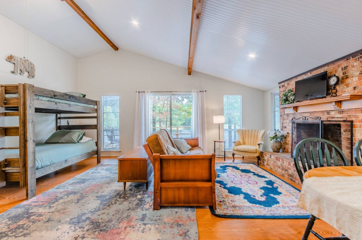 Relax with the family at this peaceful cabin on the lake. Enjoy fishing from the small private dock, kayaking, canoeing & s’mores! Bait shop within walking distance. Enjoy your morning coffee on lg front porch or enclosed back porch. Sandy beach area is less than a mile. Just 1.5 hours east from downtown Dallas. 5 min from charming downtown Mineola with shops and dining options. 10 min away from Mineola Nature Preserve & 30 min away from Canton Trade Days. 30 min away from Lake Fork.
