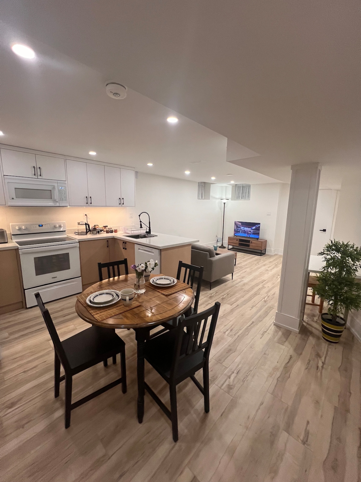 Welcome to your stylish lower-level suite in Vellore Village, a quiet, safe, and family-friendly GTA neighborhood. Perfect for work or a weekend getaway, this open-concept private suite can accommodate up to 4 people and offers a cozy bedroom with full-body mirror and ample closet space, spacious living area with a sofa bed, a modern kitchenette, smart TV with Netflix, Wi-Fi, spacious dining area, dedicated workstation, in-unit washer/dryer, and free parking.