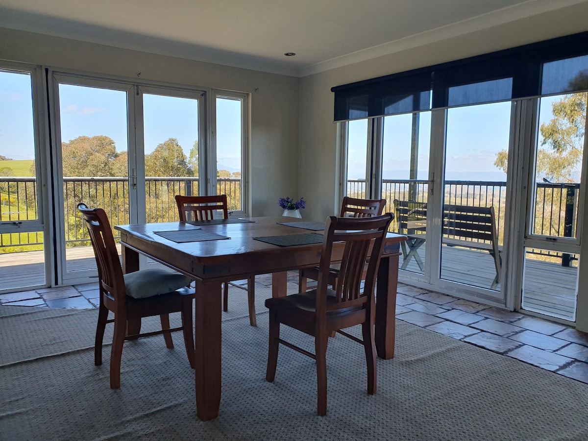 Kick back and relax in this pet friendly, peaceful & stylish space. 2 bedroom home with queen beds, a double bed and leather couch - should you need an extra bed. The home has a massive outdoor dining area with fire pit & BBQ. Inside is a split system for heating/cooling and a coonara fireplace for cold, wintry weather. Firewood can usually be purchased from the Bonnie Doon service station. Views from every window, a 10 minute drive to the local pub (dogs welcome) and lake. Come and enjoy!