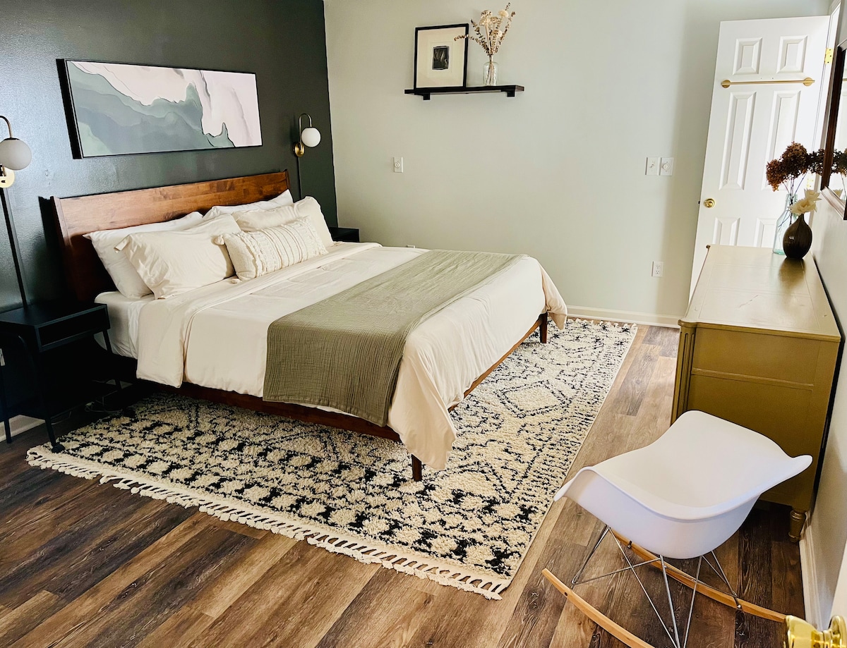 The Madera Madre - the “mother wood” gives life to the visceral vacationer and warmth to the weary traveler. Settle in with ease to your home away from home, nestled in a quiet neighborhood just a 5 to 7-minute drive from downtown. This private dream pad is the ideal hub for couples, friends, and family to explore everything Asheville. Recharge in the high-end Serta iComfort® bed with adjustable frame for an unbeatable night’s sleep! Fully equipped kitchen. Professionally cleaned!!