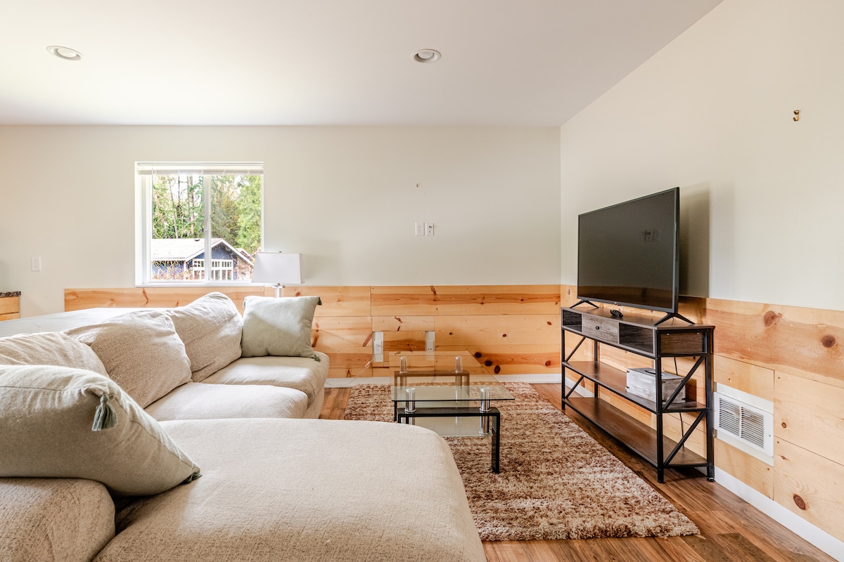 Create lasting memories at this unique, cozy, family-friendly, riverfront flat with a dock. We are located on the Sammamish River (that connects to lake WA) and the 12 mile River Bike Trail. Enjoy this cabin theme with the luxuries of being close to lively cultured towns . Outside you can enjoy the outdoor activities like kayaking and yard games. Great home base for river and bike adventures. Located within a quiet charming neighborhood. Close to UW Bothell, DT Bothell & DT Woodinville.