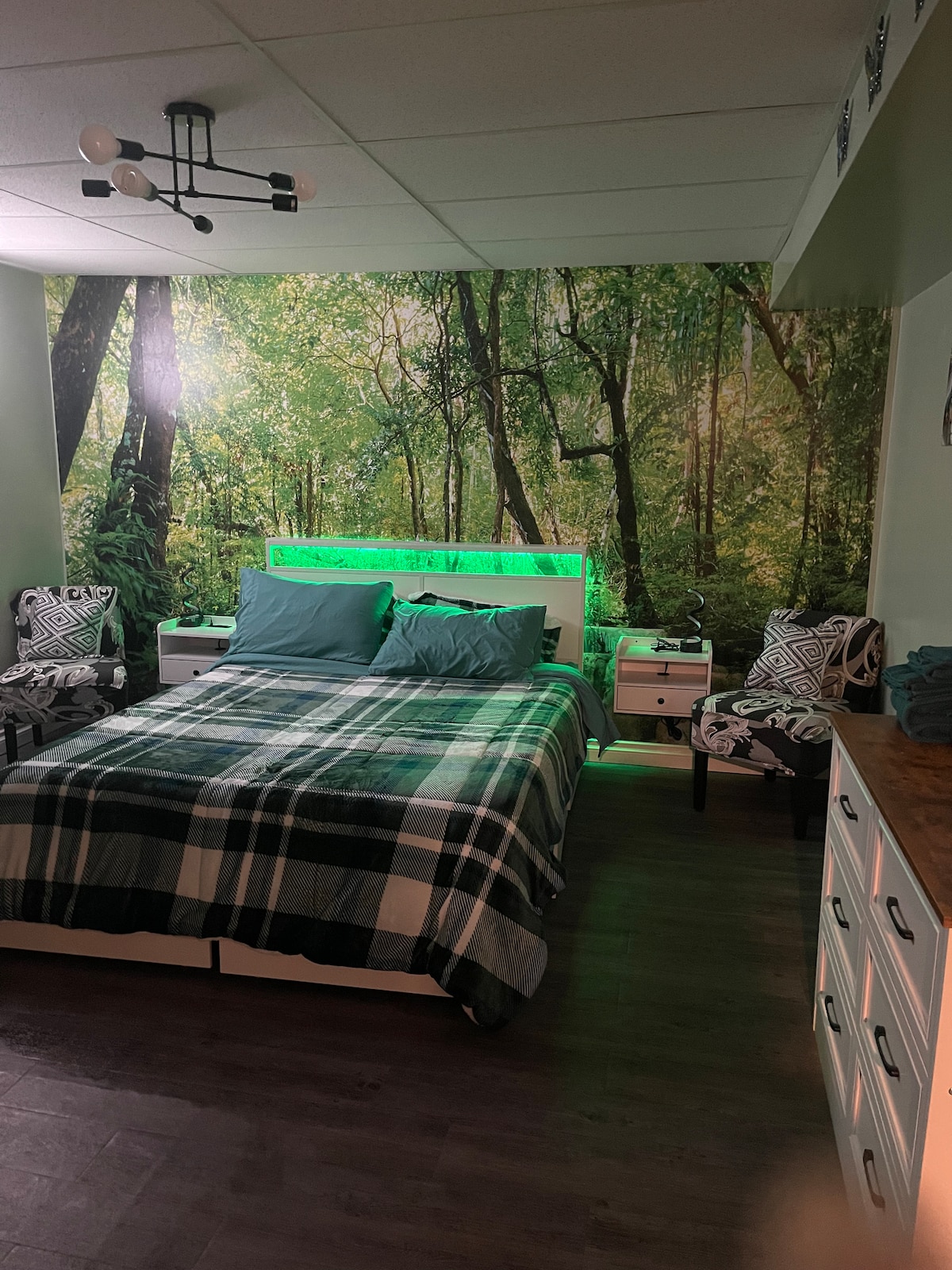 Relax and unwind in our cozy one-bedroom basement suite, with on demand hot water, a private back entrance and enough parking to fit a bus. The inviting living area has two couches and a full kitchen. Perfect for lounging after a long day of riding, exploring, or driving. Whatever it is, you will find yourself rested and ready for the day ahead. Long term stays and short term stays are welcome. Smoker on the deck for your convenience. Also includes free wifi!