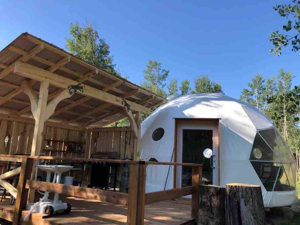 The STAR!! Accommodates 5 guests. Enjoy the stunning views of your private setting as you stay in this Special Dome. Features a Queen sized bed, and a bunk bed with a double on the bottom and single on top. There is Power and a Mini Fridge available in the covered kitchen. Outdoor toilets are available at each site, and our shower rooms are close by, open 4 to 7 PM for your convenience. Playground and trails are so close. Come and experience glamorous camping!