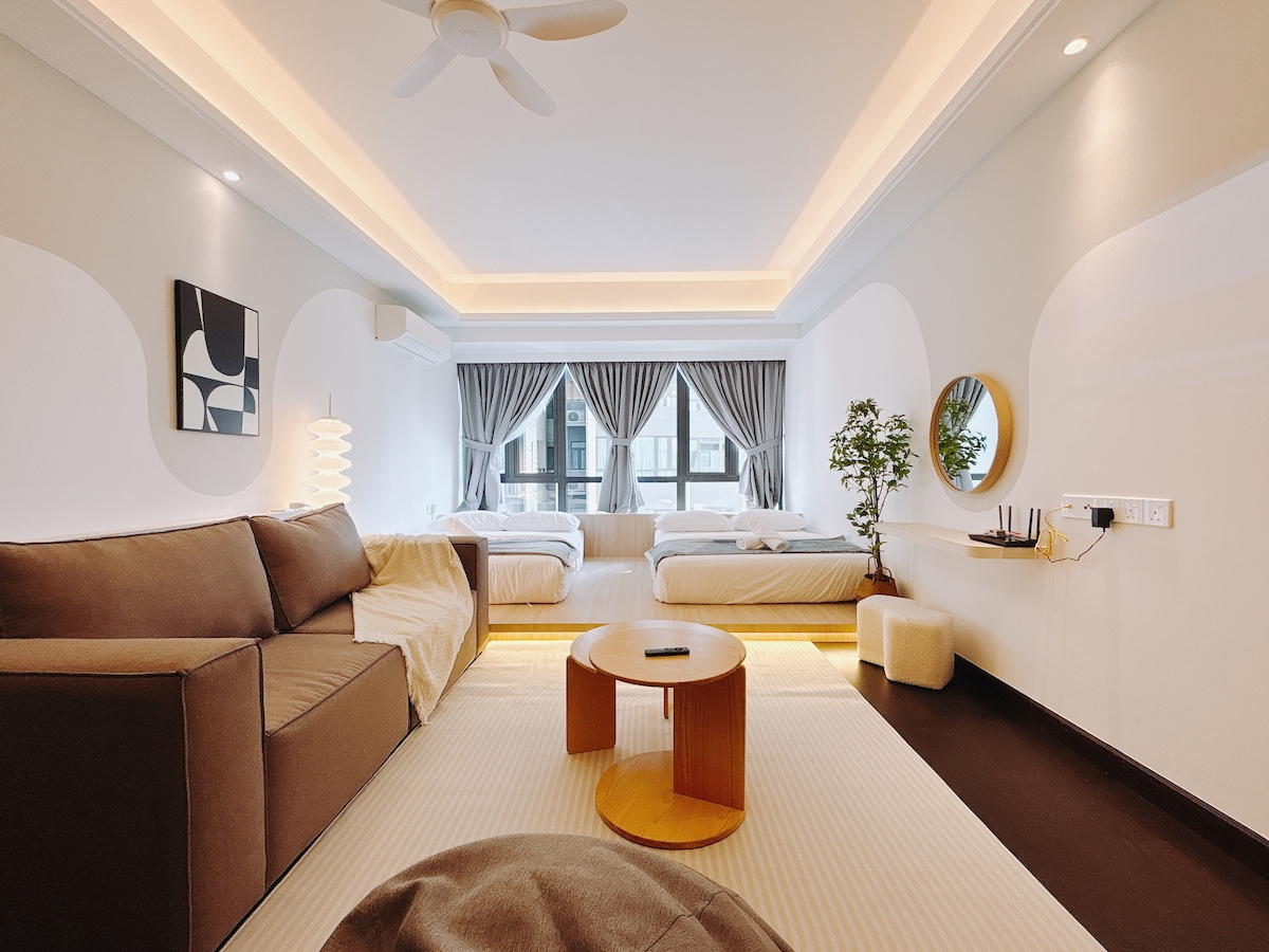 Escape to our ocean-themed getaway in RNF, where blue hues and wooden accents create a cozy resort vibe. Enjoy hotel-quality bedding and towels for ultimate comfort. Unwind with sea views, board games, and mahjong—perfect for families and friends! The master bedroom features a king-size bed, while the second bedroom has two oversized single beds. A stylish, relaxing stay awaits!