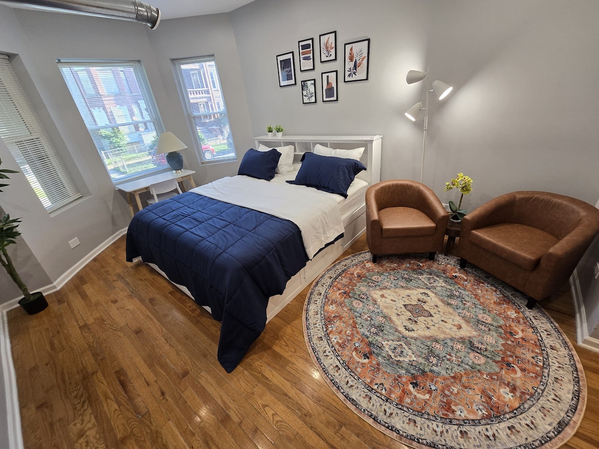 Welcome to your home away from home in the heart of one of Chicago's safest and quietest neighborhoods! This beautifully updated 1 bedroom apartment offers everything you need for a comfortable and convenient stay. It is perfect for couples, solo travelers, and business visitors. Book now for a truly unforgettable experience in the Windy City! - 1 free parking spot - 400 MB Wifi - 2 smart T.V. with access to Netflix, Hulu, Amazon and more! - Desk - Easy app paid laundry in the building.