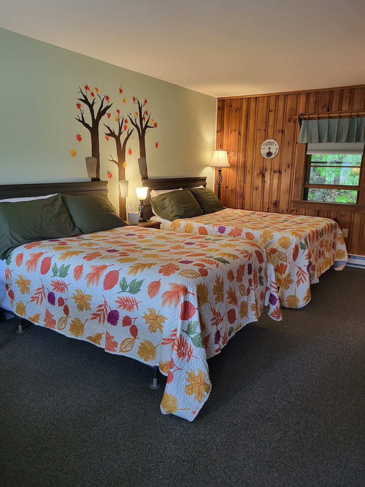 Our suites consist of two adjoining rooms: a living/dining/kitchen area and a separate bedroom, offering a variety of sleeping options, including queen, double, and twin beds. Each suite is equipped with an air conditioning unit to keep you cool on warm summer days. Enjoy access to a private beach, playground, outdoor fire pit, BBQs, and lawn games for all ages. Dock space is available upon request, and guests can also explore the beauty of Squam Lake with our kayaks, canoes, and SUP boards!