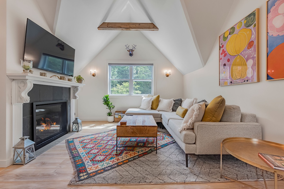 This winter enjoy the falling snow in your own private forest at the Maverick. As featured in Atomic Ranch & Country Home Magazines, the Maverick is a secluded luxuriously restored 1964 MidCentury deck home furnished with Eames and other iconic era furnishings. The Maverick is secluded yet just 5 minutes from downtown Woodstock as well as beautiful hiking, running, and biking trails. The home is perfectly set up for indoor | outdoor entertainment & dining.
