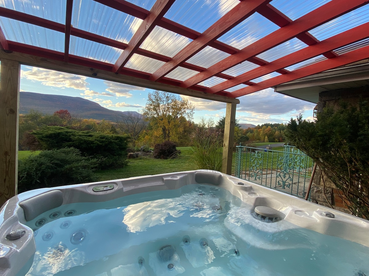 Stunning, tranquil mountainside retreat with exposed beams, saltwater swimming pool, sauna, fireplace, soaking tubs and rain shower. Situated on a 5-acre wooded hilltop a ten minute drive from Woodstock and close to miles of walking trails. Roast marshmallows on the fire pit, flip burgers on the top of the line charcoal grill, and enjoy one of the best stargazing spots around. Indoors, find a well equipped kitchen and cinema sized tv screen with Netflix/Apple TV. Convenient to ski slopes.