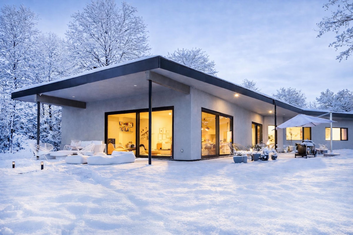 This winter enjoy the falling snow in your own private forest at the Maverick. As featured in Atomic Ranch & Country Home Magazines, the Maverick is a secluded luxuriously restored 1964 MidCentury deck home furnished with Eames and other iconic era furnishings. The Maverick is secluded yet just 5 minutes from downtown Woodstock as well as beautiful hiking, running, and biking trails. The home is perfectly set up for indoor | outdoor entertainment & dining.