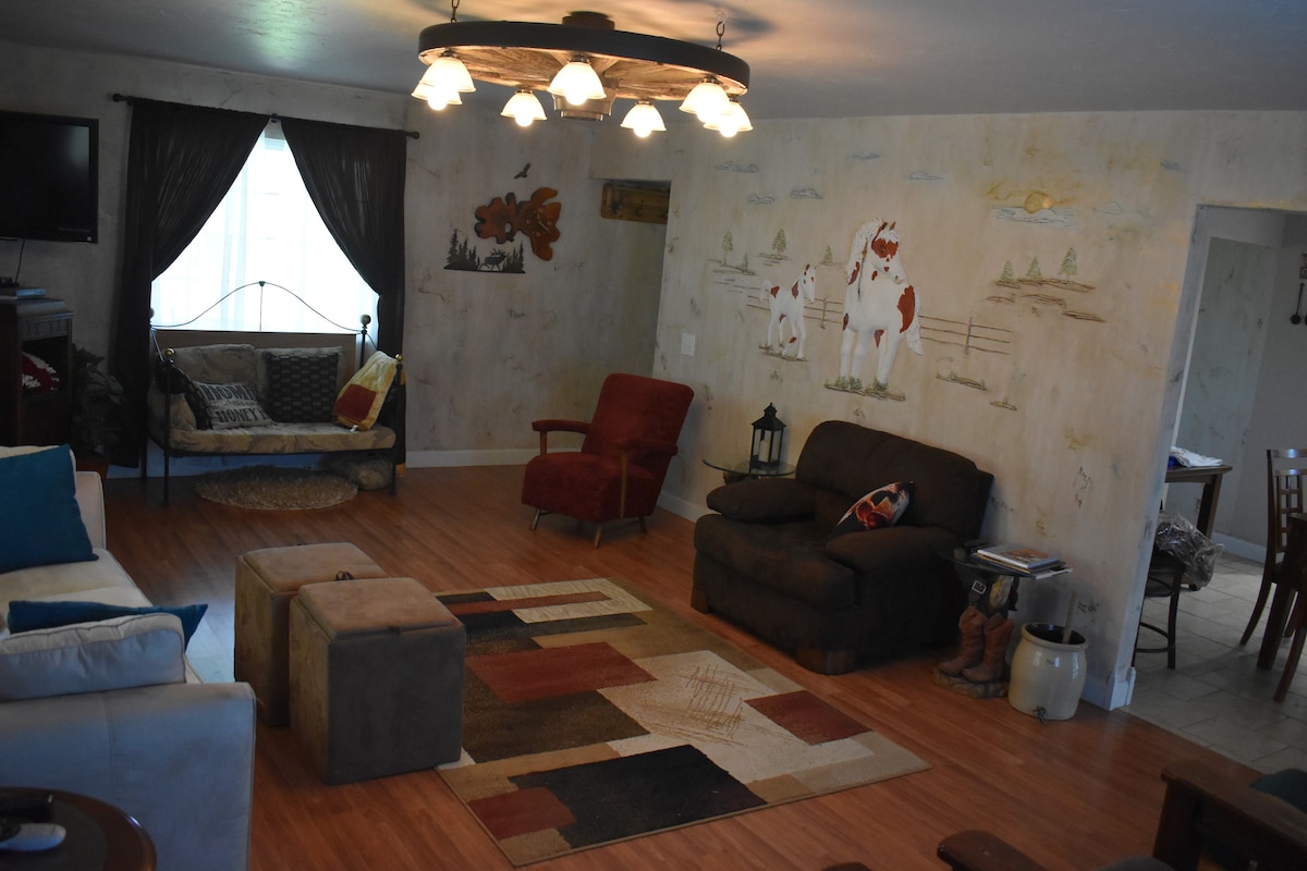 Everyone will enjoy this unique spacious area. Main gathering room is Giant. 85" TV, 200+ online movies, H/C H20 Dispenser, Central H&A & mini-split. 3 Queen Beds, 2 Twins (1 is in laundry room.) 2 sleeper Sofas & 2 XL cots. Queen auto blow up if needed. Huge parking area(see pics) This is an older home in many respects with only 1 bathroom. However it is inviting for all. Xtra folding chairs & tables. A sort of duplex w/my house separate but connected & readily available if needed. TY!