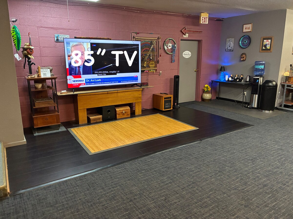 Everyone will enjoy this unique spacious area. Main gathering room is Giant 85" TV & 200+ online movies, H/C H20 Dispenser, Central H&A & mini-split. 3 Queen Beds, 2 Twins, 2 sleeper Sofas & 2 XL cots. 3 keyed BR's + 2 more w/twins... 1 is in laundry rm. Queen auto blow up if needed. This is an older home in many respects with only 1 bathroom. However it is inviting for from 1-12. Extra folding chairs & tables. This is a sort of duplex with myself next door readily available if needed. TY!