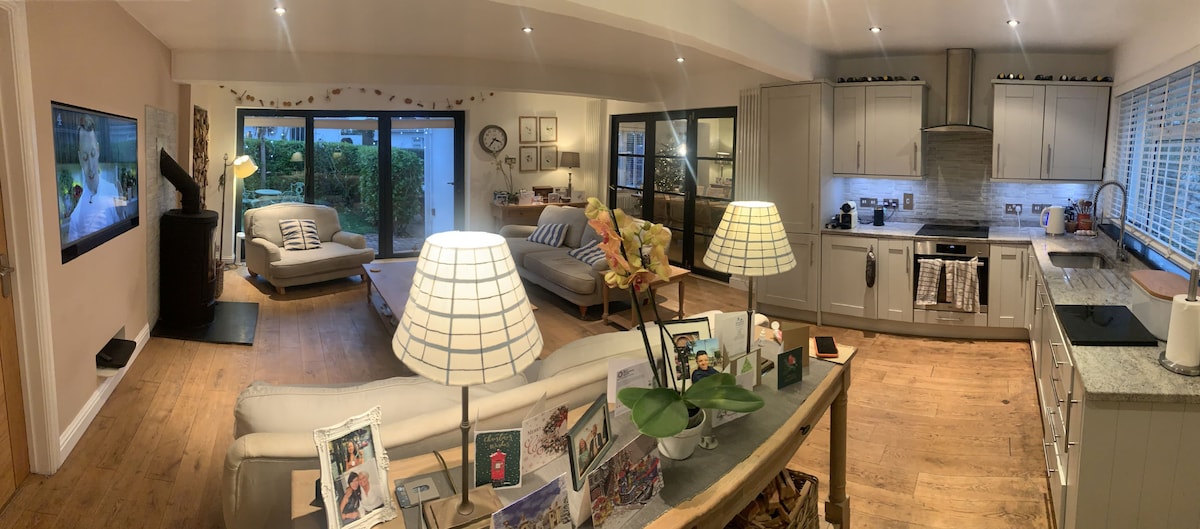 A really cozy could be anywhere in the world log cabin. Get comfortable and settle into this romantic space set in in its own grounds and private garden surrounded by trees and accessed through an original small stone barn.The trees are lit up in the evening where you can enjoy eating Al Fresco in the dry and outside with a fire and Pizza oven under a thatched Pergola and Chandelier lighting. Finish a great day at the nearby beaches and escape in quiet,enchanted surroundings for a serene evening
