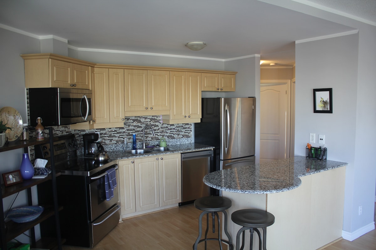 Located on the top floor, with a view of downtown, our 450 square foot condo is steps away from the heart of downtown Stratford and all it has to offer including cozy coffee shops, elegant restaurants, the Avon Theatre, close to the famous Stratford festival, and other shops for all to enjoy. Perfect for a couple’s getaway or to enjoy as friends travelling together. Our condo offers all the essentials including a luxurious queen bed, fully equipped kitchen, a 55” smart TV and ensuite laundry.