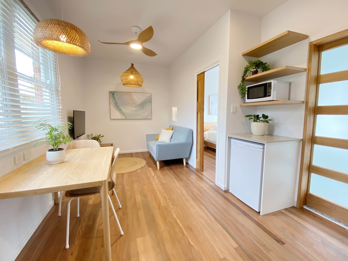 Tucked at the back of our beach home is a chic little studio, in tranquil South Golden Beach. With its own separate entrance, deck & lush garden, this relaxed space is your own private oasis. With a beautiful bed, modern bathroom and easy stroll to the beach, it offers a peaceful and intimate space to call home. We offer beach towels & bikes for guest use, plus an outdoor copper shower & fire-pit. We’re always available should you need us, but will leave you in complete privacy otherwise.