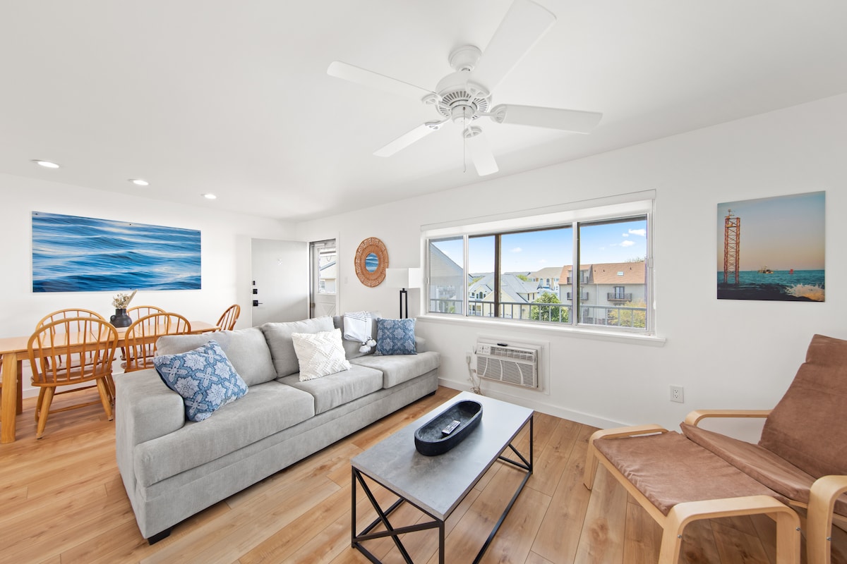 Welcome to Bayside Bliss, a stylish 2BR / 2BA top floor condo in Downtown OC. Relax in the oversized living room, stream your favorite shows and music to any of the smart tvs, or watch the sunset on the porch. The fully equipped kitchen, washer & dryer, and two full bathrooms will make your stay feel like home. Just a short walk to some of OC's best restaurants, nightlife, the boardwalk, and the beach. Steps away from the White Marlin Open weigh-ins and OC Air Show