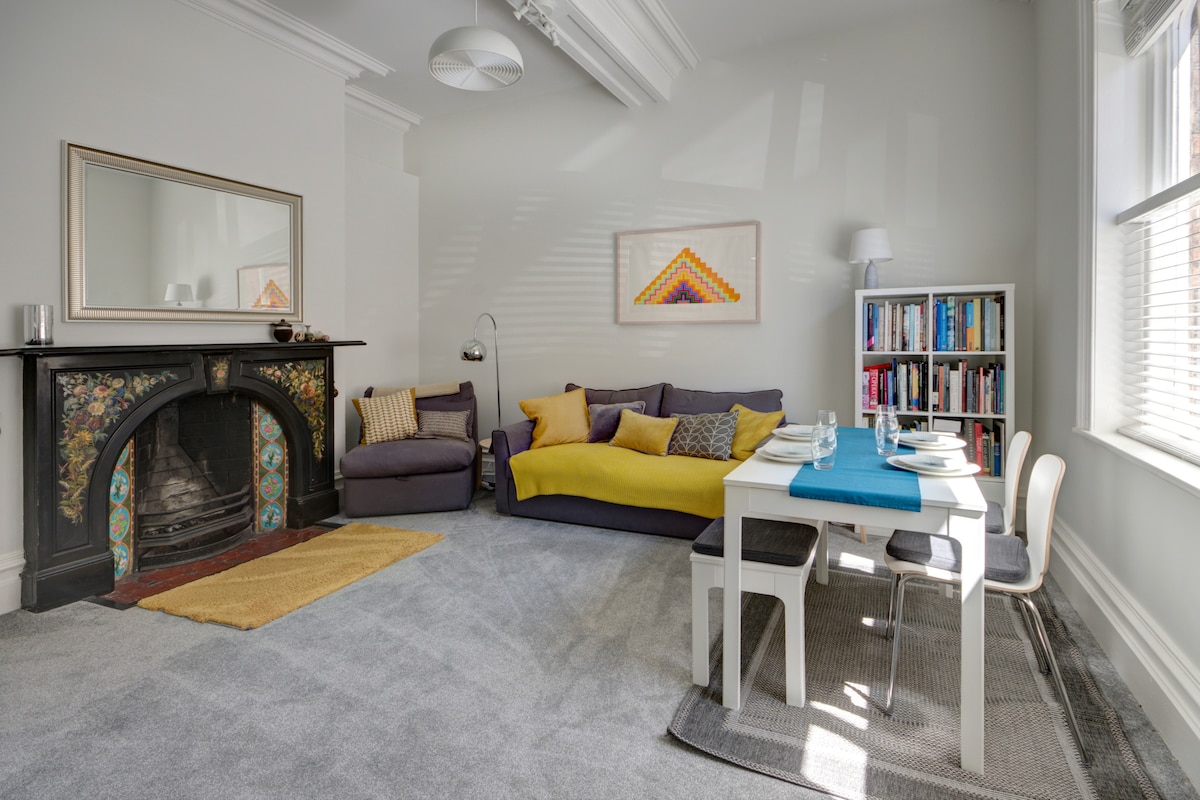 Our stylish Royalist apartment showcases an open concept kitchen & dining area with a stunning wallpaper mural, a cosy bedroom converted from a vault with eye-catching fret panel room dividers. The luxurious shower room & gorgeous Venetian plaster feature wall in the living space add a touch of sophistication. Throughout the apartment, you'll find modern, high-quality fixtures, fittings, and furnishings. Fully equipped Kitchen, Molton Brown Condiments, and full SKY SPORTS available for you.