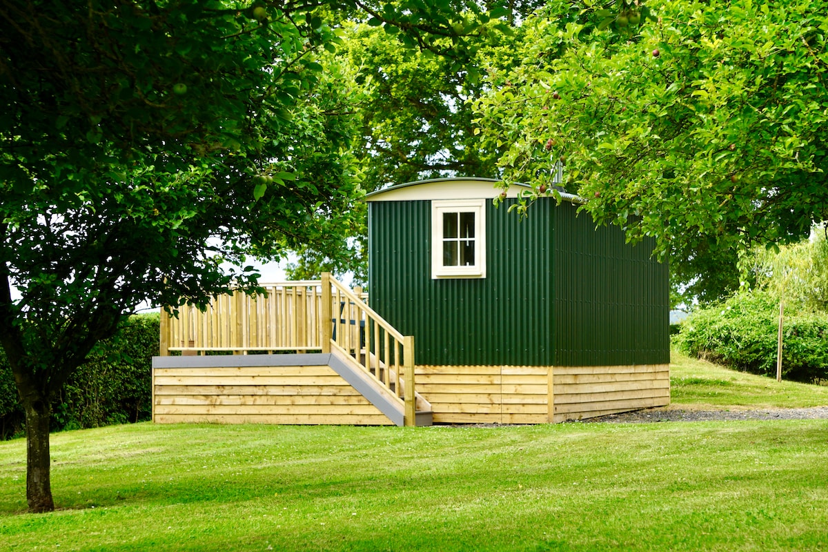 A peaceful hideaway set in its own secluded woodland area, within my one and half acre organic herb gardens and orchard. Downstairs you'll find a spacious open plan living area with fully equipped kitchen, dining area, and comfortable seating by the wood burner, with views to the fields behind and garden to the side. There's a bathroom with shower. Wake up to birdsong in the cosy double bedroom upstairs with wonderful views of the garden and fields from the velux windows.