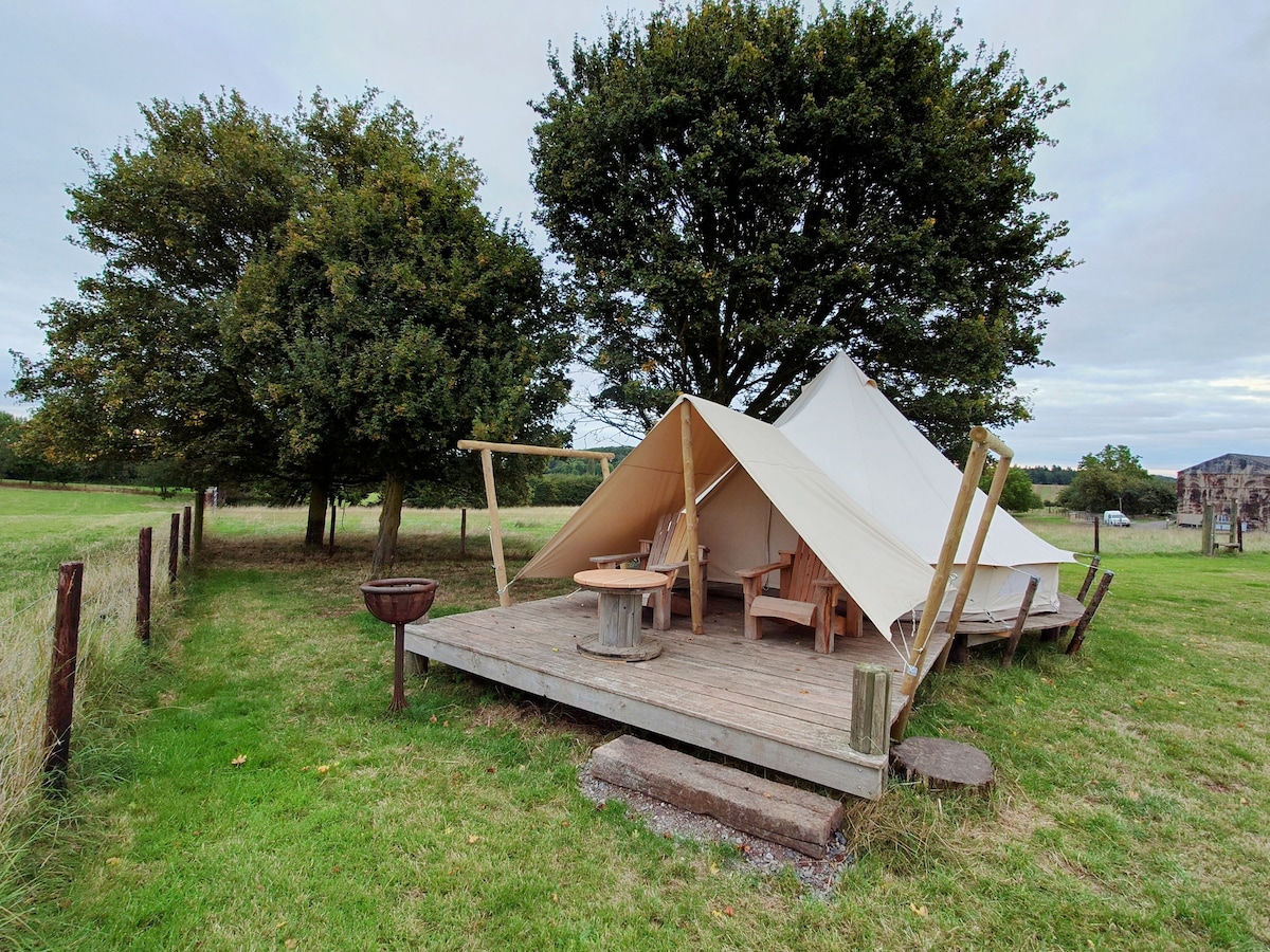 Enjoy your own secluded corner of the field on our small family run farm deep with in Herefordshire. The bell tent is nestled with in a group of maple trees, it is set off the ground and features a cosy interior a comfy king size bed with fresh bedding. You have your own private deck area complete with BBQ fire pit and seating.The bell tent is completely off grid so you can spend your day unwinding.You have your own modern bathroom just a short stroll across the field. No smocking No pets