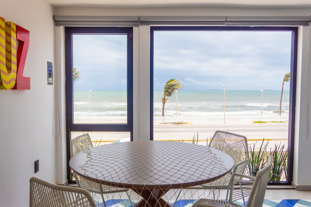 Disfruta de la vista al mar en este moderno y acogedor departamento con excelente ubicación a 30 mts de la playa y boulevard Ruiz Cortines, a pocas cuadras de los lugares icónicos del puerto: Restaurante La Parroquia, Plaza Mocambo. Cerca de bares, cafés, comida rápida, banco, farmacia y hospital. Ideal para disfrutar del encanto de la hospitalidad veracruzana. - Estacionamiento privado para 1 auto - Zona hotelera, WTC: 5 minutos - Centro histórico: 10 minutos - Parada de autobús 1 cuadra