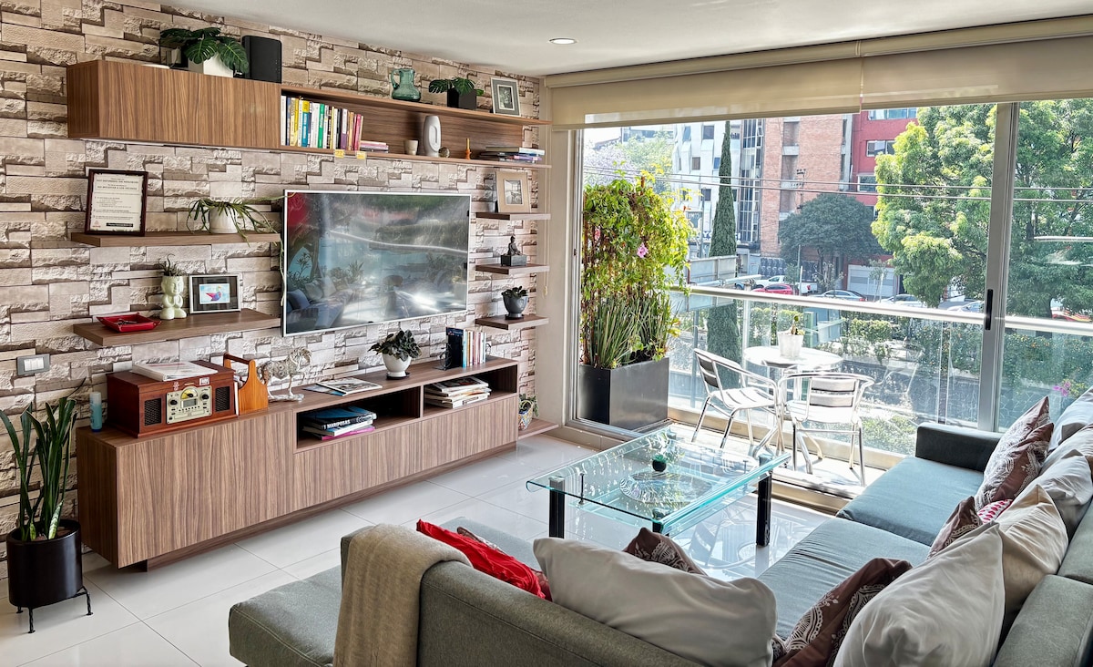 Bright apartment on the 7th floor (top level),with a balcony and views of the city and Río Becerra–Viaducto Miguel Alemán. It features 2 bedrooms with spacious closets,a living and dining area,equipped kitchen,bathroom, and floor-to-ceiling windows. Smart TVs (50"&24") with Netflix, Prime, and YouTube (guests log into their own accounts).Includes Alexa, refrigerator, microwave, and coffee maker. Pedestrian access to the building has approx. 10 steps. Ideal for a comfortable, well-connected stay.