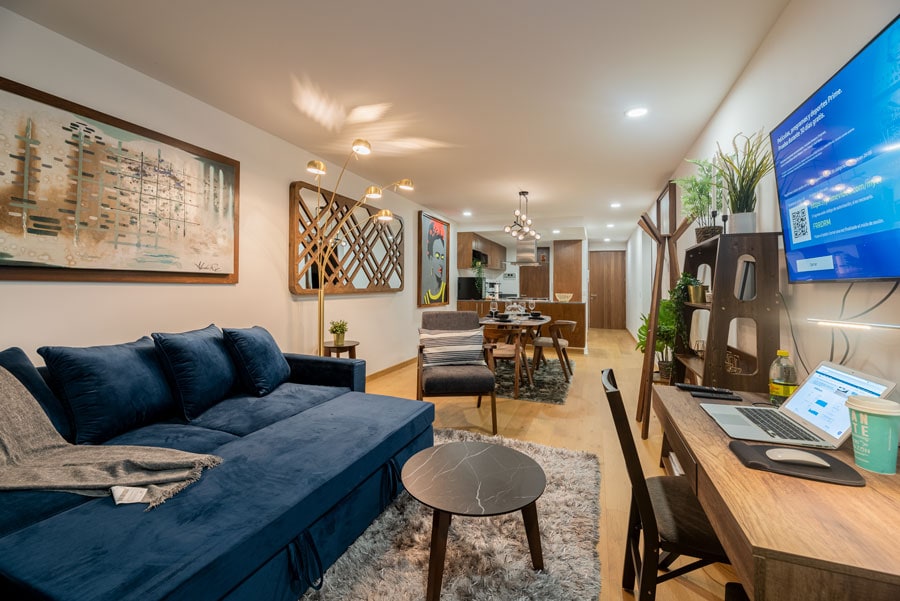 Ideal for home-office, great balcony and high-speed wifi 60Mbps ↧ 5.90 ↥ Enjoy the view of the volcanoes on a clear morning from the balcony of this bright apartment. The unit is specially designed to make your visit the most comfortable, surrounded by modern art and unique details. The building has high security 24/7 and incredible amenities: a swimming channel, well-equipped gym, pool table, ping pong tables, sauna, Jacuzzi, and exterior terrace for you to relax and enjoy sunny Mexico City