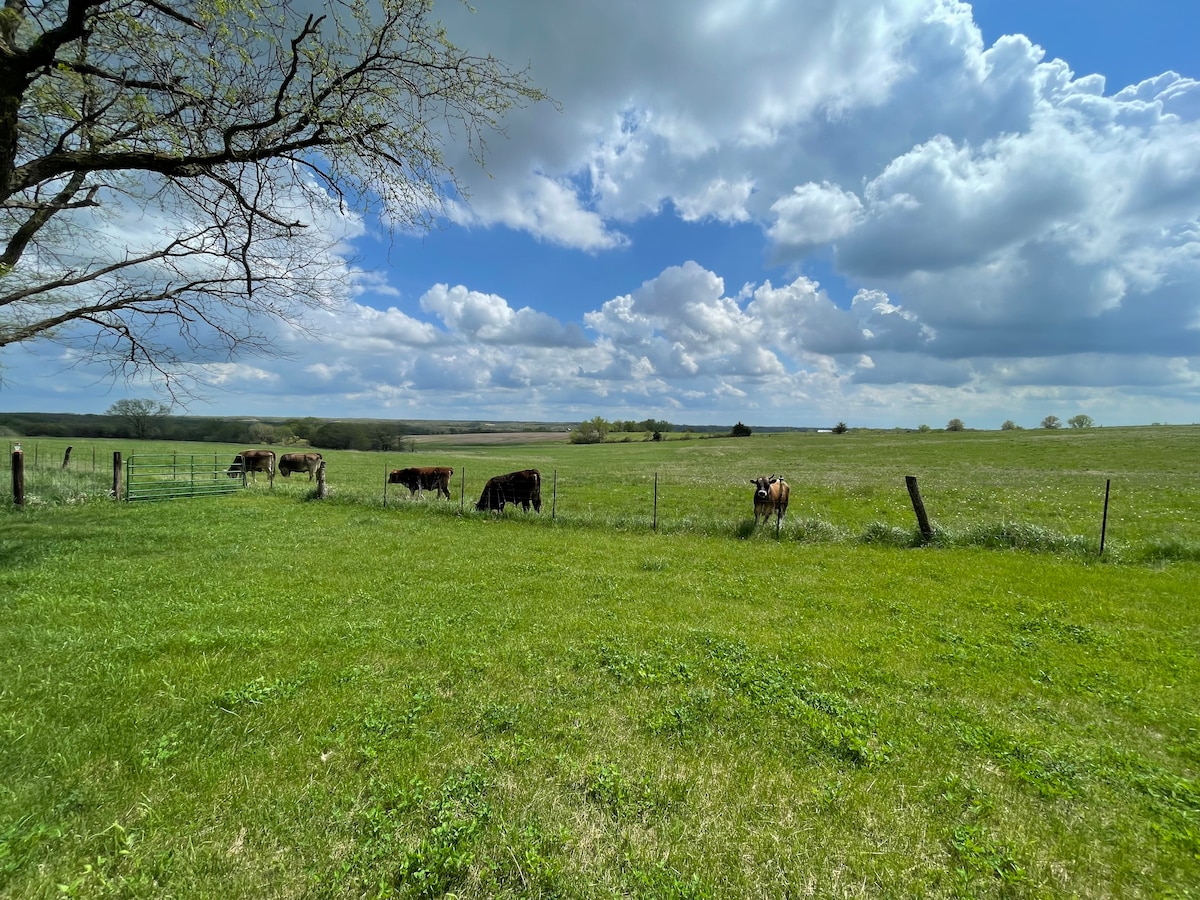 Cozy Farmhouse Retreat: Unwind at our 3-bed, 2-bath farmhouse on a 150-acre farm near Allendale, MO. Just 2 hrs from Kansas City or Des Moines, enjoy stunning Northwest Missouri hill views, wildlife watching, birding, peaceful walks/hikes, and epic stargazing under pristine clear skies. Perfect getaway.
