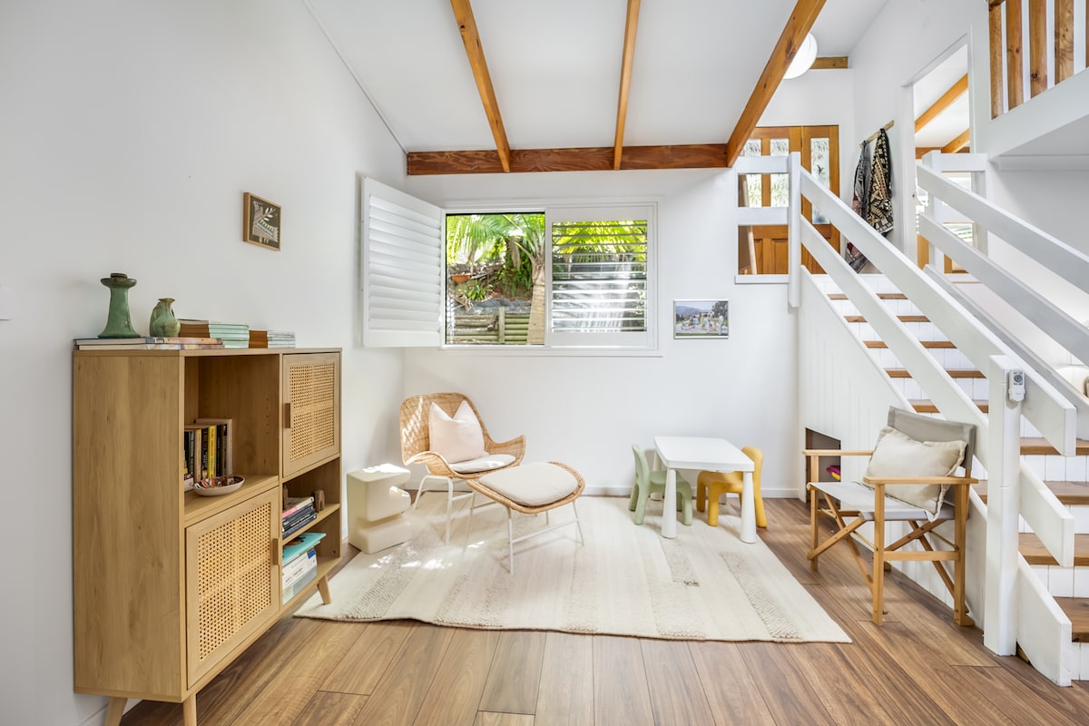 An award winning small house at the beach end of Crystal Avenue. Ideal for a couple or a small family; pets are welcome too. In its own rainforest (unfenced) garden, set back from the street and neighbours and hidden from the main house 50m behind it, it’s private and quiet. All you’ll hear are the birds and the surf. Inside you’ll find open-plan living, a cosy bedroom overlooking the garden, plus an open loft second bedroom with its own balcony.