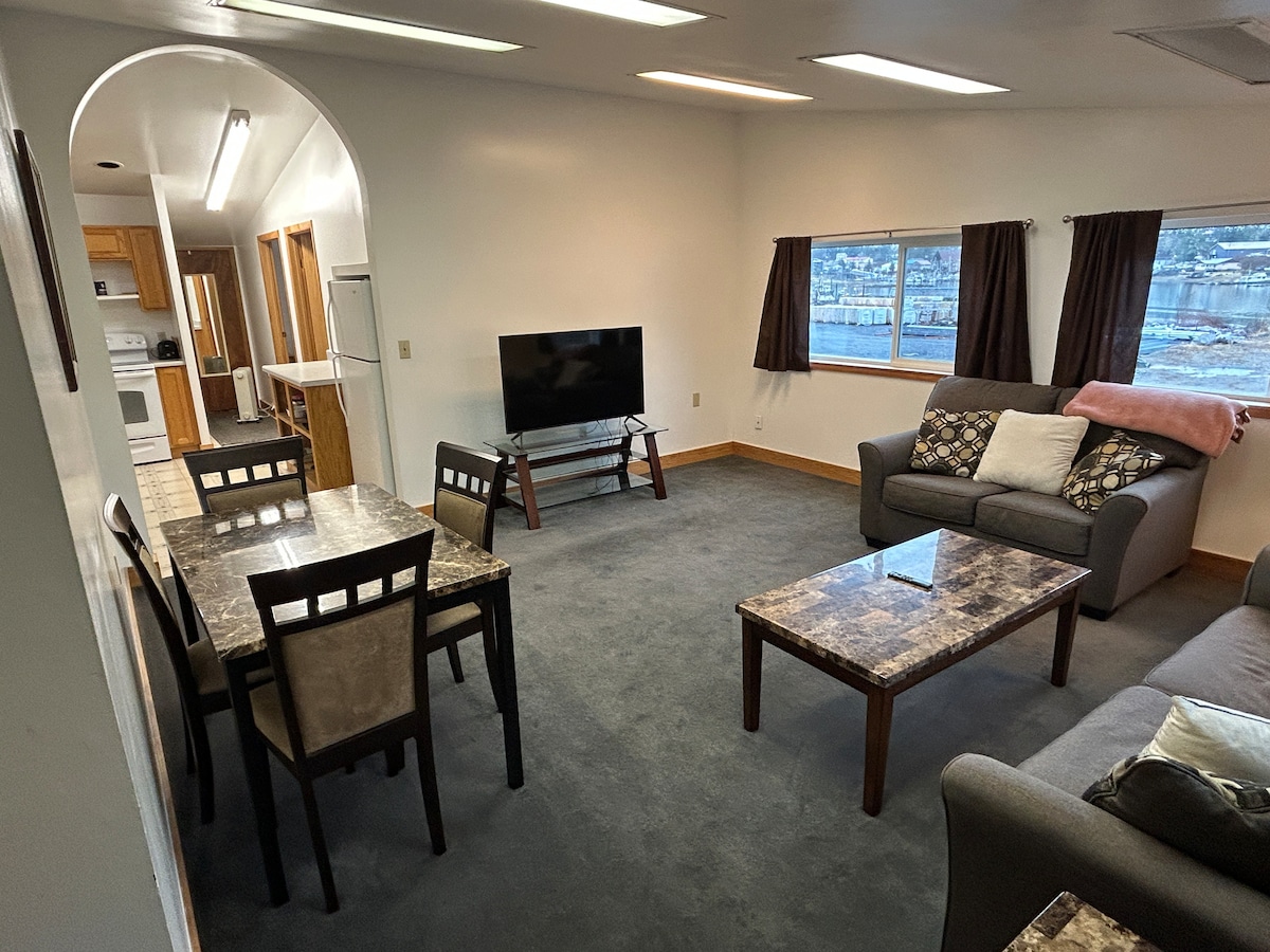 Peaceful 1 bedroom upstairs apartment with private entrance. Located on Big Salt Lake. Wifi, smart tv, living room, full kitchen, bathroom, bedroom with queen bed. Washer-dryer. Rental car available for a fee. No cleaning fee, the guest is expected to clean up after themselves. 3 miles from Klawock airport.