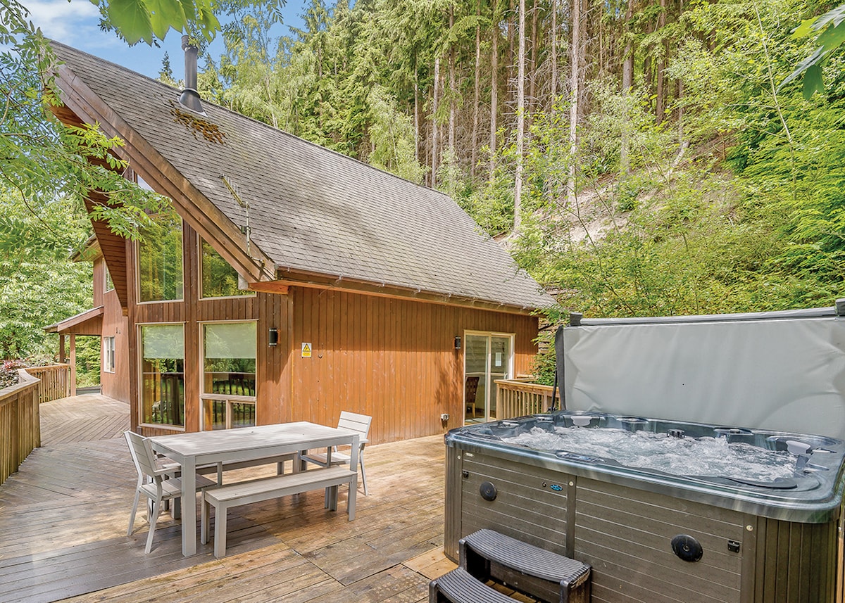 This lodge has a large sunken hot tub, with a glass canopy, on a composite decked area linked to the lake via patio doors.
