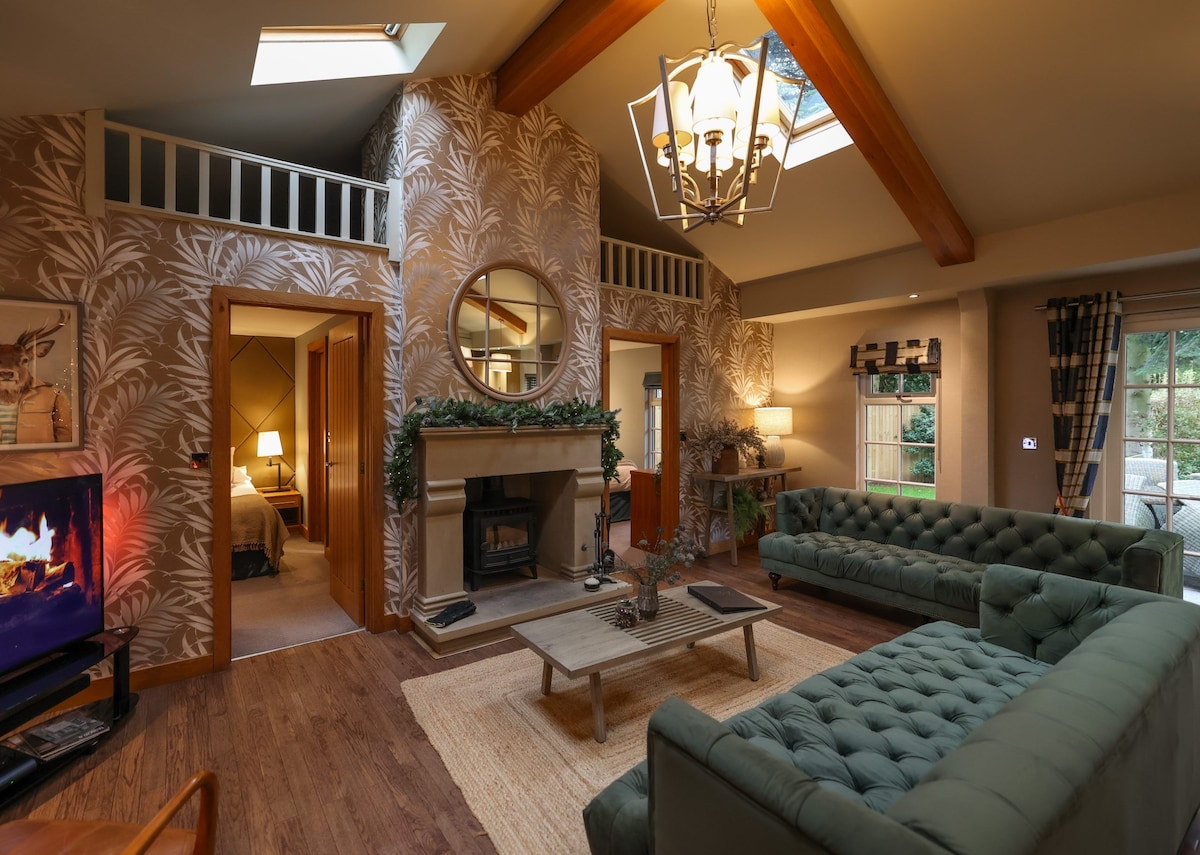 豪华原木小屋,配备热水浴缸、原木燃烧器和景观。