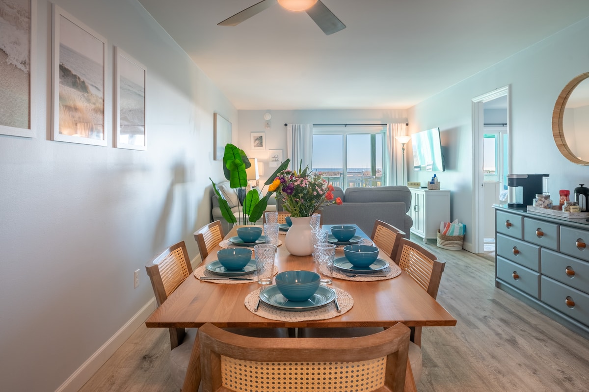 Wake up to ocean views—and often dolphins 🐬—in this first-floor, oceanfront one-bedroom condo with the best seat in the house. Enjoy a king bed, fully stocked kitchen with granite counters, and stylish new furnishings. Relax on the large deck with outdoor dining and sweeping ocean views. Resort-style pool, picnic area, WiFi, coffee, beach chairs, linens, free parking, and on-site laundry included for an easy, relaxing stay by the sea.