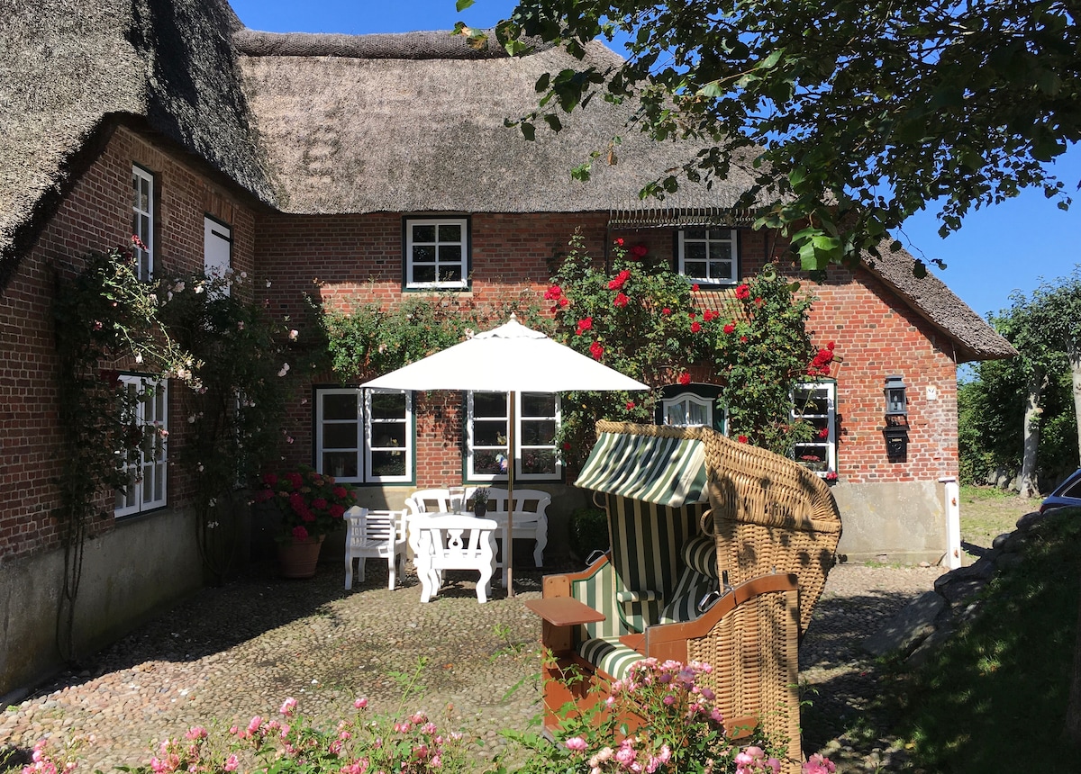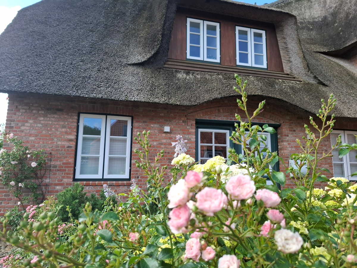 Hallo! Wir bieten unsere kuschelige Reethaus-Hälfte an. Das Häuschen hat unten 37qm, oben 28qm, insgesamt also ca. 65qm. Oben natürlich Schräge. Es steht in Boldixum auf Föhr. Das ist ein Ortsteil von Wyk. Da es nach wie vor von uns privat genutzt wird, hat es Eines nicht: den effizienten, glatten Charme eines Ferienhauses. Da, wo die wilden Rosen wuchern, da wohnen wir.