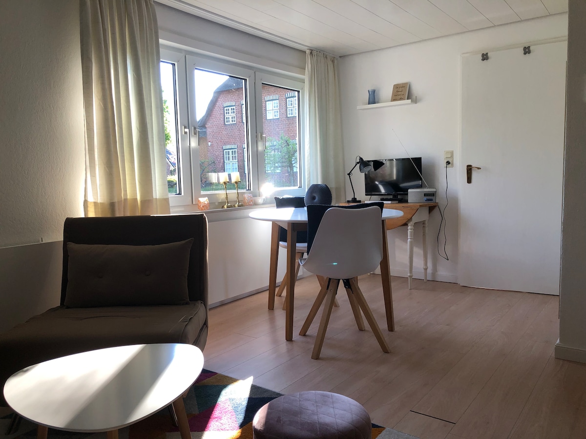 Beautiful 3-room apartment with garden, approx. 70 sqm in Morsum, completely renovated with south-facing terrace and garden, open kitchen-living room, fully equipped. Living room, hallway, bathroom, 2 bedrooms with windows, terrace and garden. High-quality equipment, including baby bed, children's high chair, bathtub, washing machine and dishwasher, Nespresso machine, oven, 4-burner stove, cable TV, WiFi, gas grill and piano. 5 minutes walk from the train station and the sea, max. 1 dog welcome!