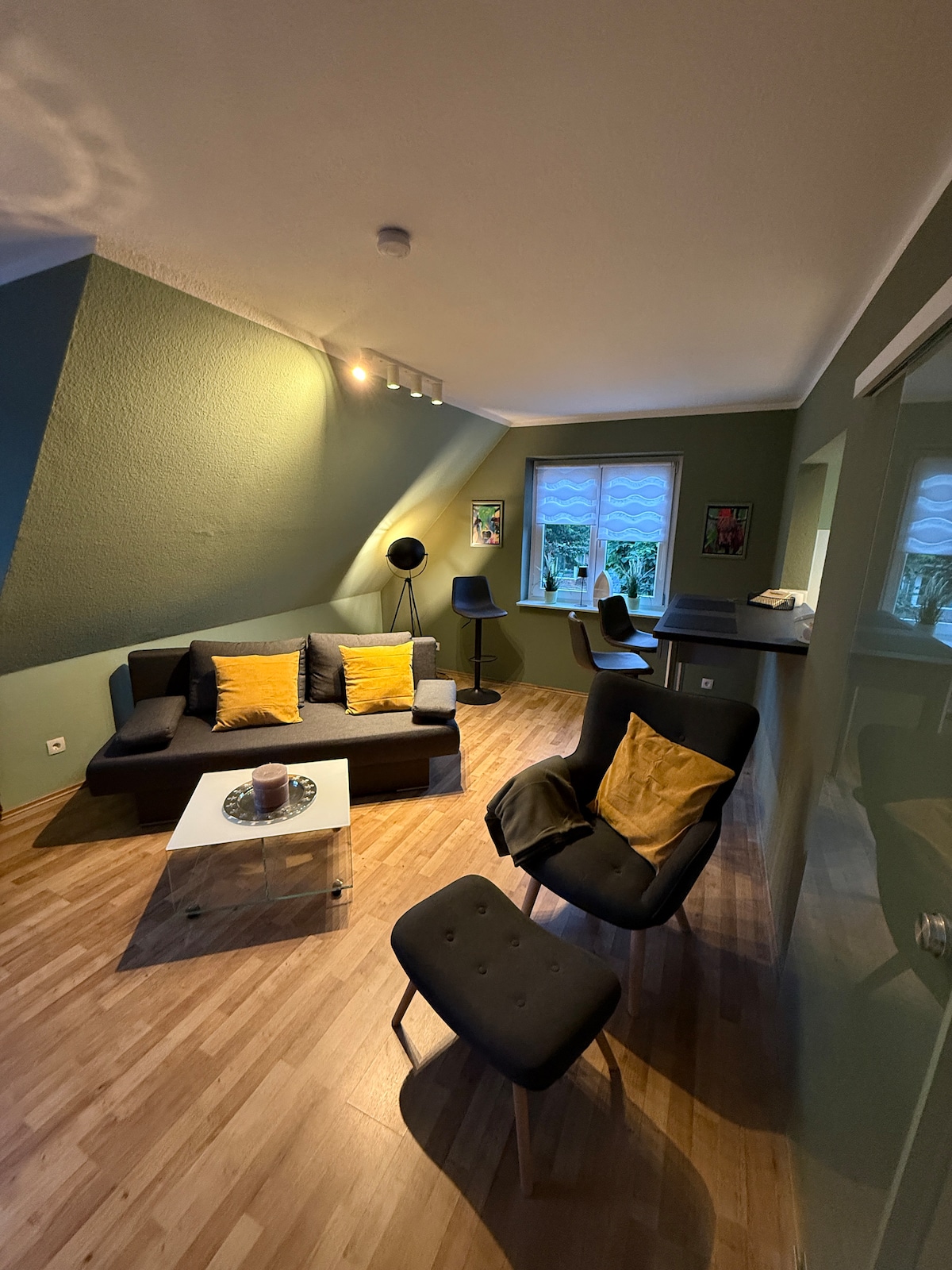 Unser kleines Appartement für 2 Personen direkt am Wald bietet einen idealen Ausgangspunkt für Ausflüge. Der Strand ist in etwa 10 Minuten Fußweg gut zu erreichen. Die Unterkunft im Dachgeschoss hält einen Wohn- Essbereich mit Ausziehcouch und viel Licht bereit. Die Küchenzeile ist dem Wohn-Essbereich zugewandt und durch eine Bar wie ein kleiner Raum im Raum angelegt. Das separate Schlafzimmer ist mit einem Doppelbett (1,40m breit) ausgestattet und verfügt über einen Blick Richtung Wald.