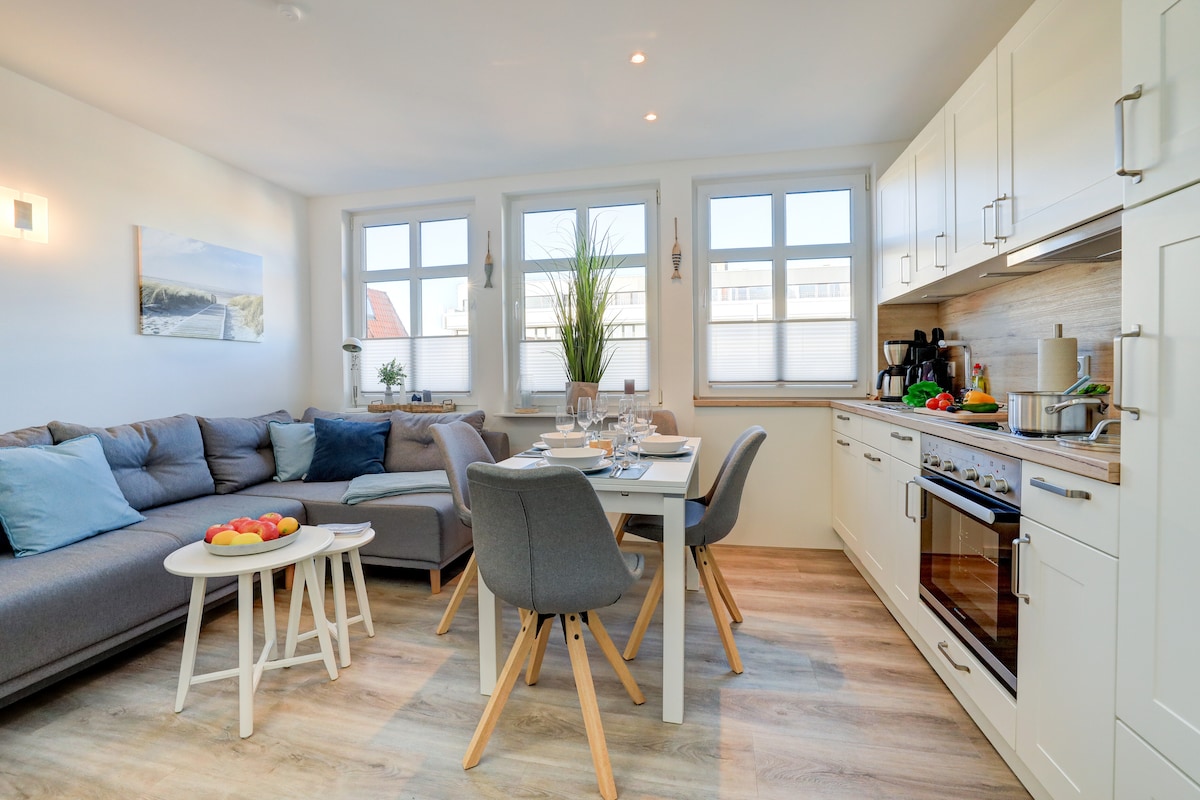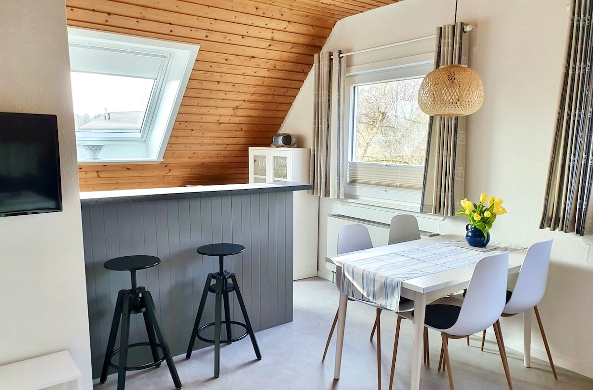 Unser kleines Appartement für 2 Personen direkt am Wald bietet einen idealen Ausgangspunkt für Ausflüge. Der Strand ist in etwa 10 Minuten Fußweg gut zu erreichen. Die Unterkunft im Dachgeschoss hält einen Wohn- Essbereich mit Ausziehcouch und viel Licht bereit. Die Küchenzeile ist dem Wohn-Essbereich zugewandt und durch eine Bar wie ein kleiner Raum im Raum angelegt. Das separate Schlafzimmer ist mit einem Doppelbett (1,40m breit) ausgestattet und verfügt über einen Blick Richtung Wald.