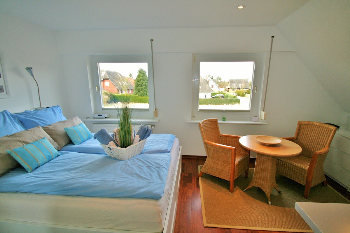 Du wohnst in der Mitte der wunderschönen Insel Föhr in dem Örtchen Midlum. Der loftartige Gästebereich im Obergeschoss meines traumhaften Reetdachhauses heißt Dich herzlich Willkommen. Dir stehen eine eigene Küche und Badezimmer zur Verfügung. Schlafen wirst Du in einem 140x200 großen Bett. Ein Küchensofa als Bett (80x200 m) für einen 3. Gast ist vorhanden. Gemütlich machen kannst Du es Dir auf der Couch vor dem Fernseher. Die Kurtaxe ist vor Ort bei mir in bar separat zu entrichten.