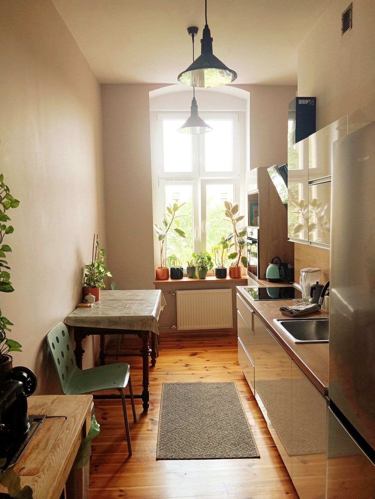 Admire how modern features blend harmoniously into a period apartment. A sunny front room overlooks a leafy neighborhood while houseplants and botanical prints continue the natural motif indoors. A cabinet displays a collection of elegant dinnerware. The apartment is near the city center of Wroclav. It's a 10 minutes by tram or 25 minutes walk to the centre (Arkady)Although a tram stop is close by, this is an incredibly quiet and peaceful place. Some quirky local cafes are just around the corner