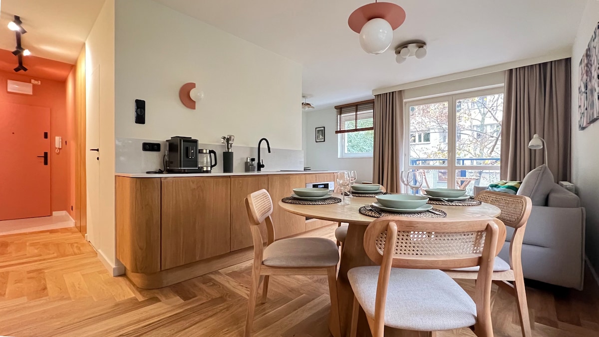 Explore Wrocław's tranquil oasis: where nature intertwines with urban living! My delightful, situated by the river apartment boasts verdant views. Relax near the park, yet stay conveniently close to the city center. Easy access to transportation and nearby landmarks such as Centennial Hall and the Multimedia Fountain ensures a delightful stay. Step into your cozy sanctuary and soak up the sunlight from our east and west-facing windows, filling the space with natural light.
