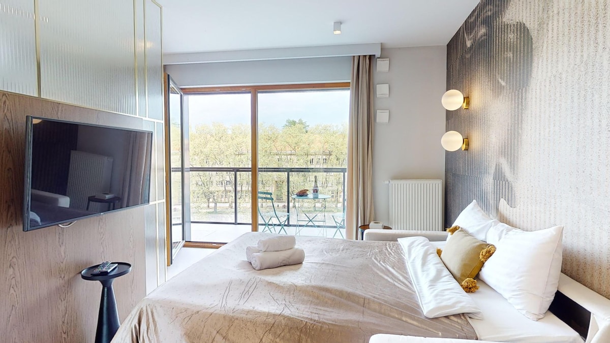 Stylowe miejsce na pobyt blisko centrum, z licznymi restauracjami i pięknym parkiem w okolicy. Apartament oferuje taras, bezpłatne WiFi oraz imponujący widok na miasto z ostatniego piętra budynku.Do dyspozycji Gości jest salon z telewizorem z płaskim ekranem i dostepem do aplikacji typu Netlix, Youtube etc, w pełni wyposażony aneks kuchenny z jadalnią i zmywarką do naczyń.Apartament posiada rownież przytulna sypialnie z oddzielna garderoba i swietnie wyposażoną łazienkę z nowoczesna pralka.