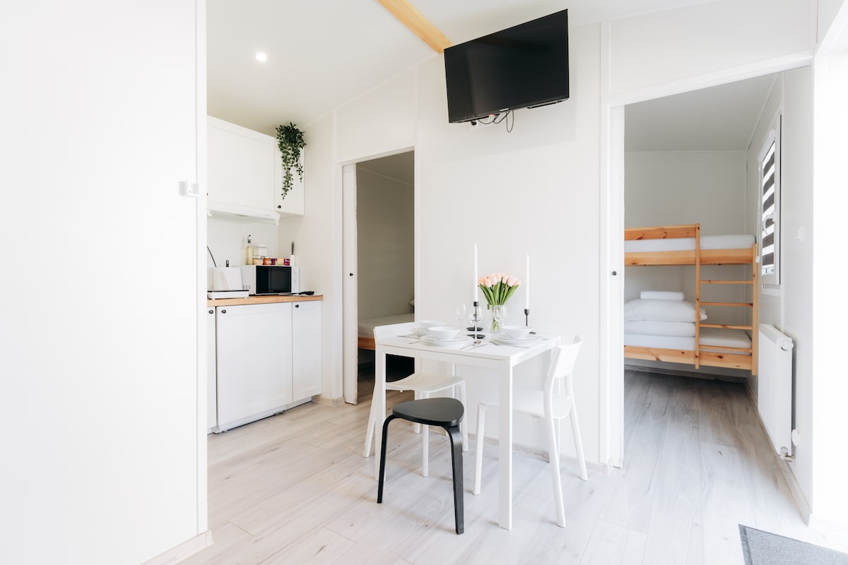 Domek może zmieścić maksymalnie 6 osób. W domku znajduje się salon z rozkładaną kanapą(pościel: 1 kołdrę, 2 poduszki, 1 prześcieradło, 2 ręczniki), telewizorem, aneks kuchenny ze standardowym wyposażeniem oraz prywatna łazienka. Do dyspozycji są dodatkowe 2 sypialnie. W 1 sypialni do spania służy łózko małżeńskie (pościel: 1 kołdrę, 2 poduszki, 1 prześcieradło, 2 ręczniki), w 2 sypialni łózko piętrowe (pościel: 2 kołdry, 2 poduszki, 1 prześcieradło, 2 ręczniki) . Domek o powierzchni 27 m.