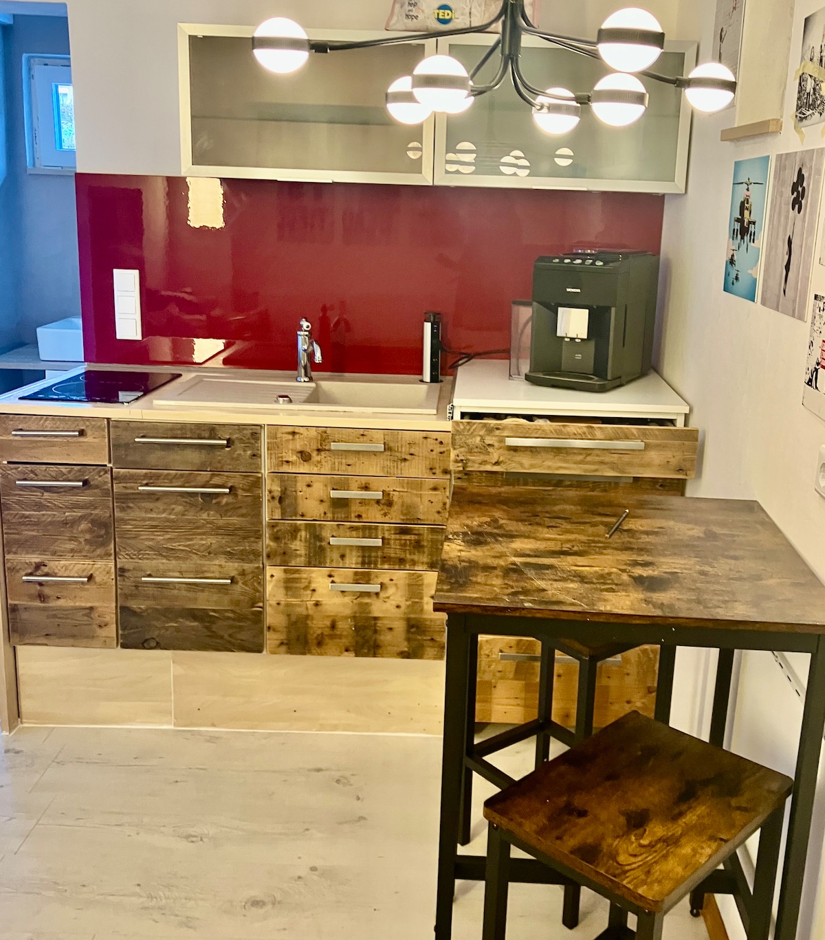 This little hut is an idyll for everyone who likes it simple. The couch can be pulled out, so the hut would be suitable for e.g. Suitable for families. The direct access to the outside is particularly attractive for our guests and a small terrace invites you to linger and relax. The hut is heated with an oven. A spacious kitchen and bathroom are located across the courtyard in the main house. The kitchen can possibly also be used by guests of the holiday apartment.