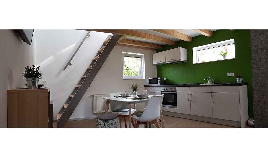 Separates Nebengebäude mit Maisonette-Wohnung mit Schlafgalerie, Schreibtisch, Sofa, Sessel und Tisch, separate Küche und Dusche/WC, Sauna inkl. Ruhebereich, neuwertige Ausstattung, komplette Renovierung 2001. Vermieter wohnen im Hauptgebäude eines komplett kernsanierten und renovierten ehemaligen Bauerngehöftes. Der ehemalige "Schweinestall" wurde zu Garage und Gartenhaus umgebaut. Im Obergeschoß befindet sich die Ferienwohnung. Fachwerk und die ursprüngliche Atmosphäre wurden erhalten.