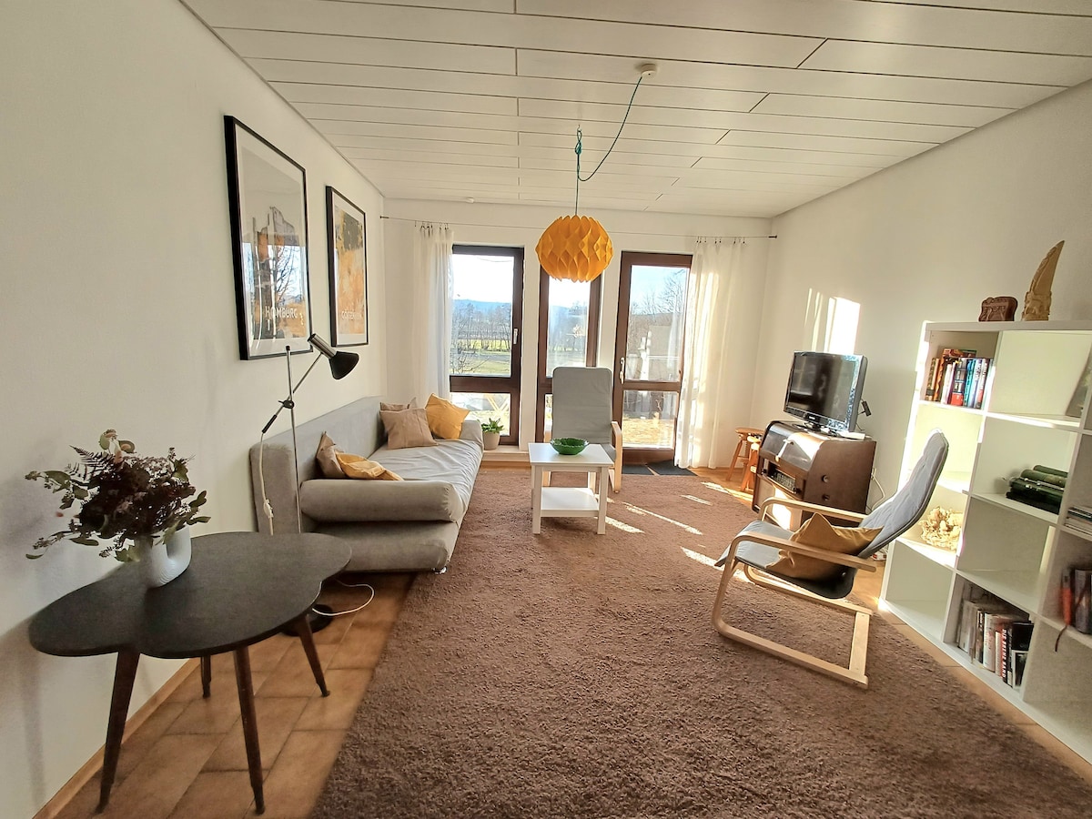 Großzügige und hochwertig ausgestattete Ferienwohnung mit 3 Schlafzimmer und 2 Bädern. Helles, sonniges Wohnzimmer mit fussbodentiefen Panorama-Schiebefenster, Parkettboden und gemütlichen Kaminofen Große hochwertige, voll ausgestattete Wohnküche. Großer Balkon mit Blick ins Grüne. Garage für Fahrräder und hauseigener Parkplatz im Hof.