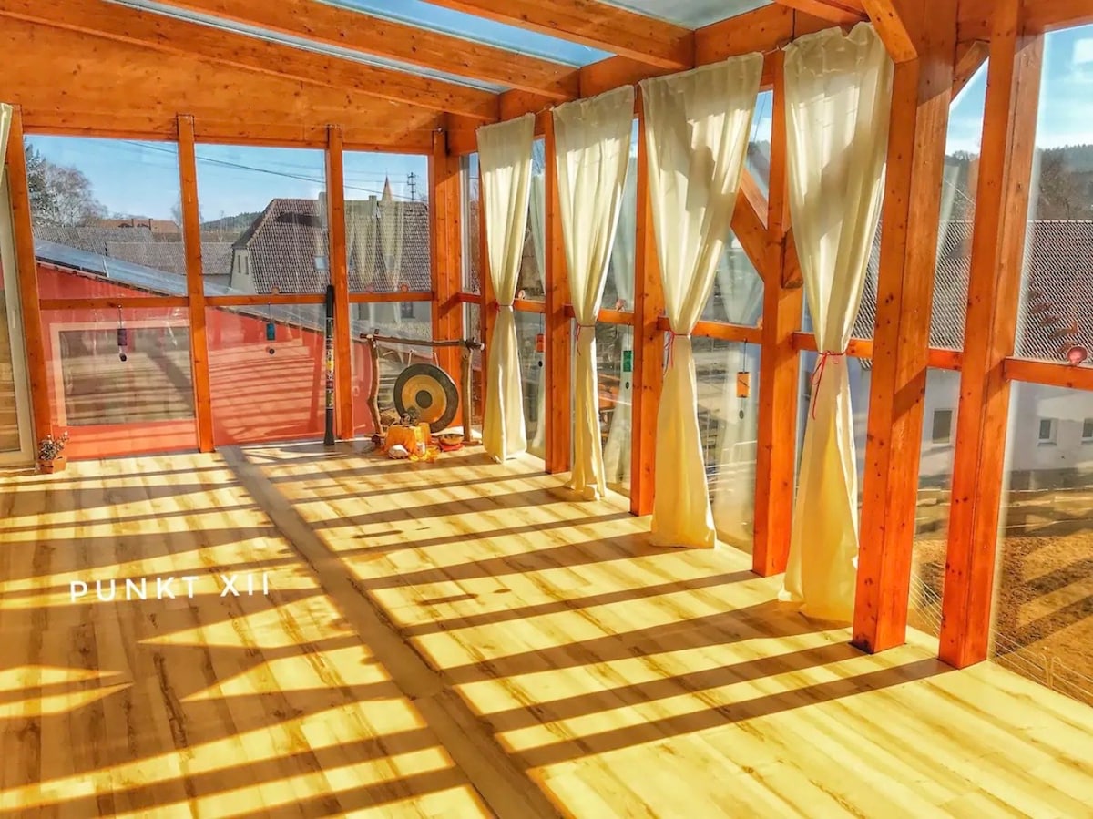 Seminarwohnung mit Weitblick über den Steigerwald → Großzügige Gruppenwohnung im besonderen Retreat-Ort Punkt XII → Ideal für Gruppen & Familien: bis zu 12 Schlafplätze → Heller Seminar- & Aufenthaltsraum mit weitem Naturblick → Flexible Zimmeraufteilung für gemeinsames Wohnen → Küche, Balkon & viel Platz zum Ankommen → Kostenlose Parkplätze direkt am Haus → Große Gastroküche & Speiseraum optional buchbar → Ruhe, Natur & besondere Atmosphäre im Steigerwald "kombinierbar mit anderen Wohnungen "