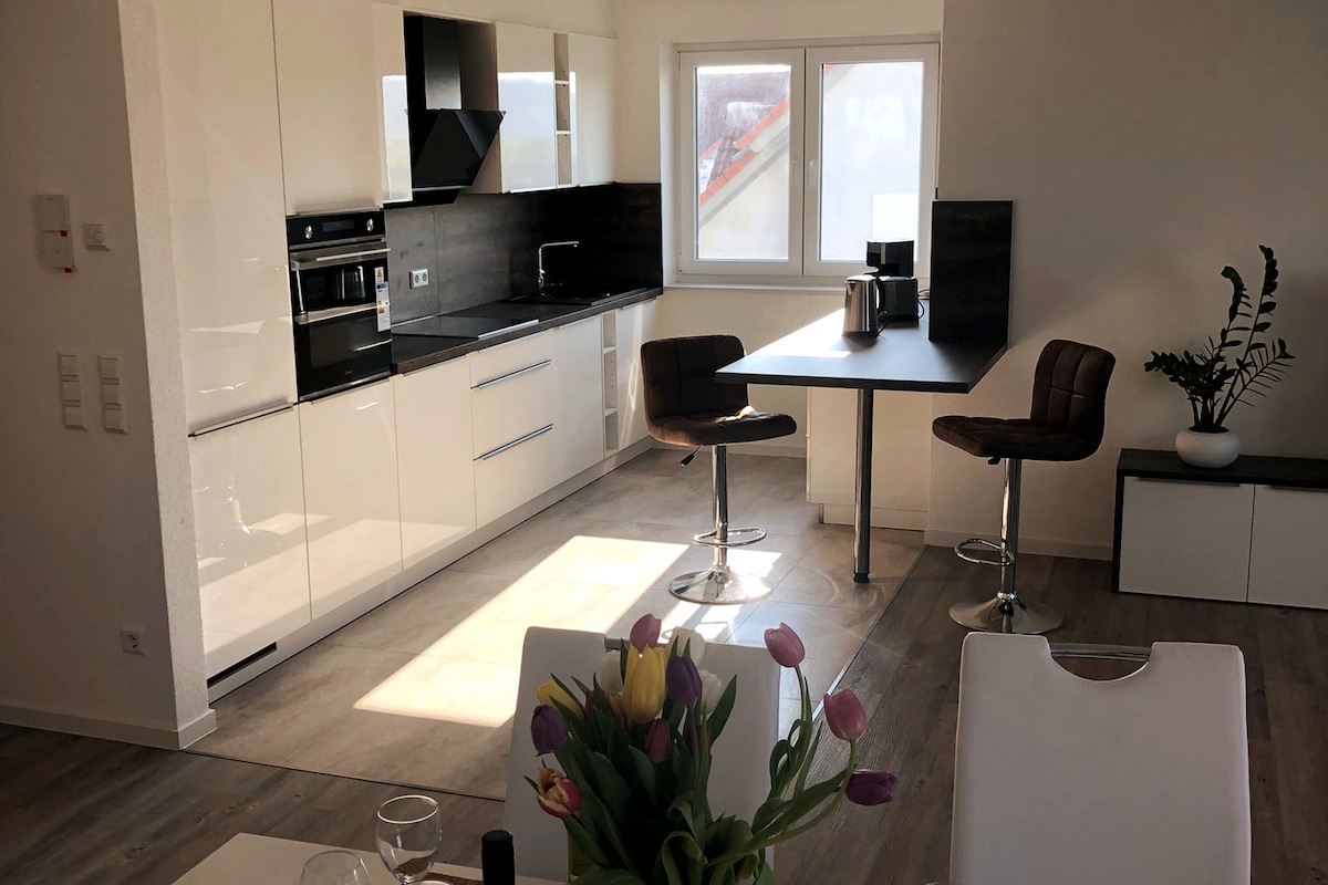 Wir würden uns freuen, Sie in unserer neu eingerichteten Dachgeschoss-Ferienwohnung begrüßen zu dürfen. Die Wohnung liegt in einem ruhigen Viertel von Werneck. Im Ortskern befinden sich verschiedene Einkaufsmöglichkeiten, wie zb. Lebensmittelgeschäfte, Drogerien die ca. 2 km von der Ferienwohnung entfernt sind. Unserer helle Ferienwohnung verfügt über 2 Zimmer (ca. 60m²). Offener Wohn-Essbereich mit Küche und Balkon. Ideal für Familien. Auch Handwerker sind herzlich willkommen .