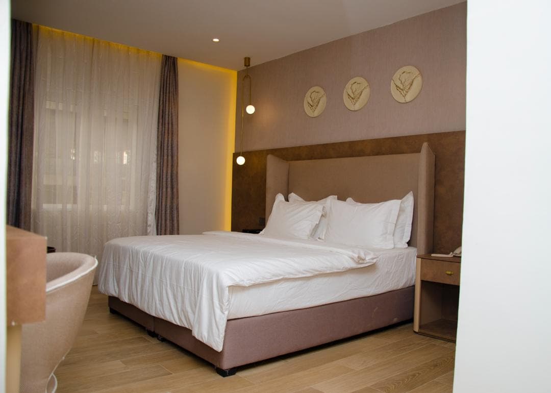 🗸Complimentary breakfast, welcome drink and premium bottled water 🗸Plush bed with crisp linens 🗸In-room safe 🗸Convenient bedside charging & nightstands 🗸High-speed Wi-Fi 🗸Enhanced bathroom amenities {Bathrobe and luxury slippers} 🗸Access to indoor hotel, bar and shared lounge 🗸Minutes from the city centre, major freeways, and the airport 🗸Close to Abuja National Mosque, National Christian Centre, Yar’Adua Centre, art venues, and Jabi Lake Mall 🗸Children under 13 stay free. Book Now!