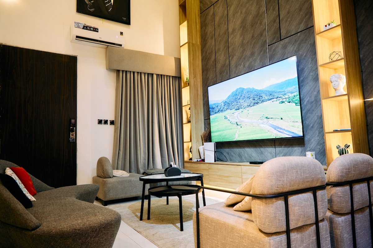 Step into comfort in this stylish studio apartment, ideal for solo travelers or couples seeking a relaxing getaway. Enjoy a tastefully furnished space featuring a plush bed, a smart TV, a modern bathroom, a private balcony and a well-equipped kitchenette for your convenience. The apartment also comes with a backup inverter system, and free cleaning so you can stay connected and comfortable even during power outages. Book your stay today!