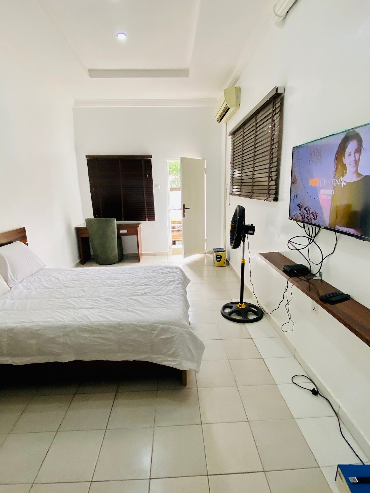 Escape the hustle of the city in this spacious, stylish studio apartment. The contemporary aesthetic of this space is perfect for couples’ getaways or solo travellers It is fully furnished + located in a secure estate. The space is serviced with free, super-fast Wifi & ample parking space The kitchen is fitted with modern equipment for your convenience. With 24/7 electricity, our smart TV & other luxurious amenities make this a home away from home, with the trappings of a dreamy hotel suite.